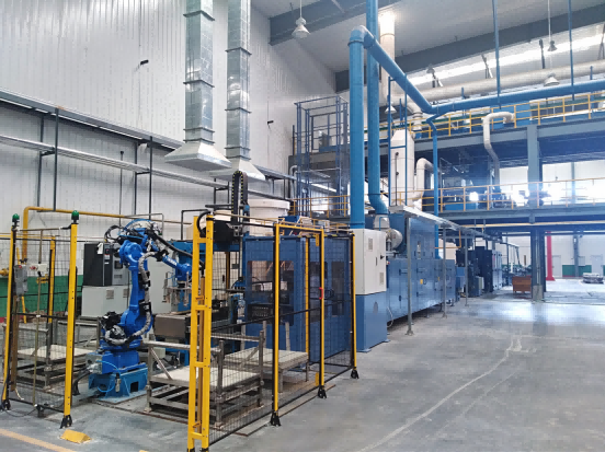 ▲機械手收板(駱駝新疆蓄電池) 該項目是集團公司聚焦“雙碳”目標與產業升級需求啟動的重點攻關項目,是為鉛酸蓄電池生產企業提供綠色節能生產車間的設計及關鍵核心裝備制造。項目團隊通過工藝流程再造,構建起“綠色工藝+智能裝備+數字管控”的全鏈條創新體系,從源頭減少鉛消耗和三廢排放,減少工人數量,提高了單位面積產出比,提高了生產效率,系統性破解了傳統鉛蓄電池生產中鉛耗高、污染重、效率低的行業痛點,最終實現鉛酸蓄電池的綠色生產。 目前,該項目研發的工藝技術和設備已在駱駝股份、風帆股份、超威集團、天能股份、理士國際等知名鉛酸蓄電池生產企業成功應用,使企業的生產效率大幅提升,人工成本、生產能耗和物耗大幅降低,鉛、酸污染物排放指標優于國家標準,資源和能源消耗指標、污染物控制指標均優于國家清潔生產一級基準值,經濟效益、環境效益和社會效益顯著。