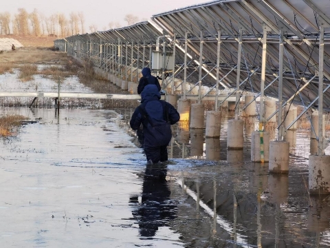 項(xiàng)目并網(wǎng)以后往往得花更多的時(shí)間去維護(hù)發(fā)電設(shè)施,這就要求運(yùn)維人員將已經(jīng)損壞的設(shè)備替換下來(lái),以保證整個(gè)系統(tǒng)的正常運(yùn)行。自8月份以來(lái),突如其來(lái)的三場(chǎng)臺(tái)風(fēng)給設(shè)備安全穩(wěn)定運(yùn)行帶來(lái)嚴(yán)峻考驗(yàn)。進(jìn)入電站的必經(jīng)之路已被大水淹沒(méi),根本看不到路在哪里,所見(jiàn)之處,都是積水,多處道路已變成深水區(qū),運(yùn)維人員沒(méi)有退縮,“沒(méi)有路也要?jiǎng)?chuàng)造路,就算蹚也得把設(shè)備送進(jìn)去”。于是,運(yùn)維人員便經(jīng)過(guò)深水區(qū)運(yùn)送設(shè)備,濕透半截的褲管是不懼臺(tái)風(fēng)影響最好的證明。地面積水嚴(yán)重,而光伏組件高度大多超過(guò)3米,被水浸泡過(guò)的地面無(wú)法固定絕緣梯,這給運(yùn)維人員維護(hù)發(fā)電設(shè)備制造了嚴(yán)重障礙,檢修設(shè)備難度大大增加,但這依然阻擋不了運(yùn)維人員進(jìn)行設(shè)備運(yùn)維的決心。面對(duì)地面無(wú)法固定梯子的困境,運(yùn)維人員紛紛化身“智多星”,群策群力,出謀劃策,最后決定在絕緣梯頂端加裝掛鉤,再用頂端的掛鉤懸掛在光伏支架上進(jìn)行維護(hù),解決運(yùn)維難題。 氣溫驟降,寒風(fēng)颯颯;不懼嚴(yán)寒,站好每一班崗。 由于太陽(yáng)能華北區(qū)吉林片區(qū)地理位置特殊,常年伴有天氣轉(zhuǎn)涼的跡象,在寒冷的天氣下工作已經(jīng)是運(yùn)維人員的工作常態(tài),但是在零下30-40度的嚴(yán)寒氣溫下進(jìn)行設(shè)備巡檢工作,還是給運(yùn)維人員帶來(lái)了極大的挑戰(zhàn)。在巡檢現(xiàn)場(chǎng),經(jīng)常可以看到扶在設(shè)備上面的手凍得通紅,已經(jīng)變得僵硬。嚴(yán)重的時(shí)候甚至很難進(jìn)行正常的維護(hù)工作,回暖也需要好一陣子。可是時(shí)間就是發(fā)電量,設(shè)備提前一分鐘維護(hù)好,我們就多發(fā)一度電。光伏廠區(qū)嚴(yán)禁煙火,于是運(yùn)維人員只能用體溫取暖的方式,將自己的手揣在衣服里貼著皮膚來(lái)進(jìn)行緩解,只有這樣才能既保證安全,又能將設(shè)備檢修故障盡快完成。 并網(wǎng)在即,關(guān)卡重重;盡心盡力,發(fā)揮最大的價(jià)值。