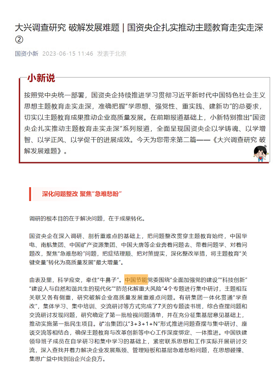隨著主題教育的深入開展,中國節能將持續精準發力,把理論學習、調查研究、推動發展、檢視整改等貫通起來、一體推進,扎實做好學習貫徹習近平新時代中國特色社會主義思想的深化、內化、轉化工作,以實干實績交出高質量發展的生動答卷。